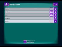 The Permissions button opens an overview of the diverse built-in permissions (formerly known as "room roles"), i.east., "Creator", "Co-Owner", "Host", "Everyone" else, and the (noneditable) "Defaults". Y'all tin can assign permissions to any of your friends by tapping the people button next to the specific permissions. The "Only show my permissions" checkbox shows all your permissions. If your current permissions specify different values for the aforementioned setting, the top-most permissions take precedence.